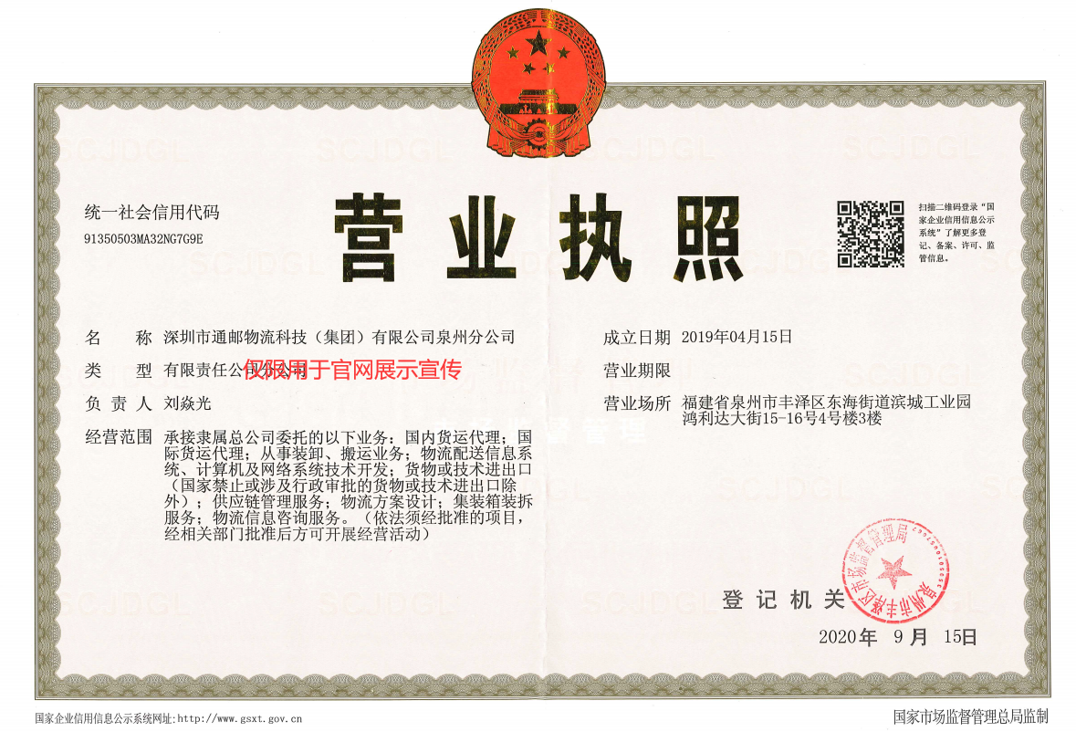 泉州通邮是深圳市通邮物流科技(集团)有限公司泉州分公司,成立于2019年4月,位于福建省泉州市丰泽区东海滨城鸿利达大街15-16号4#楼3楼,货物揽收范围为周边30公里内。